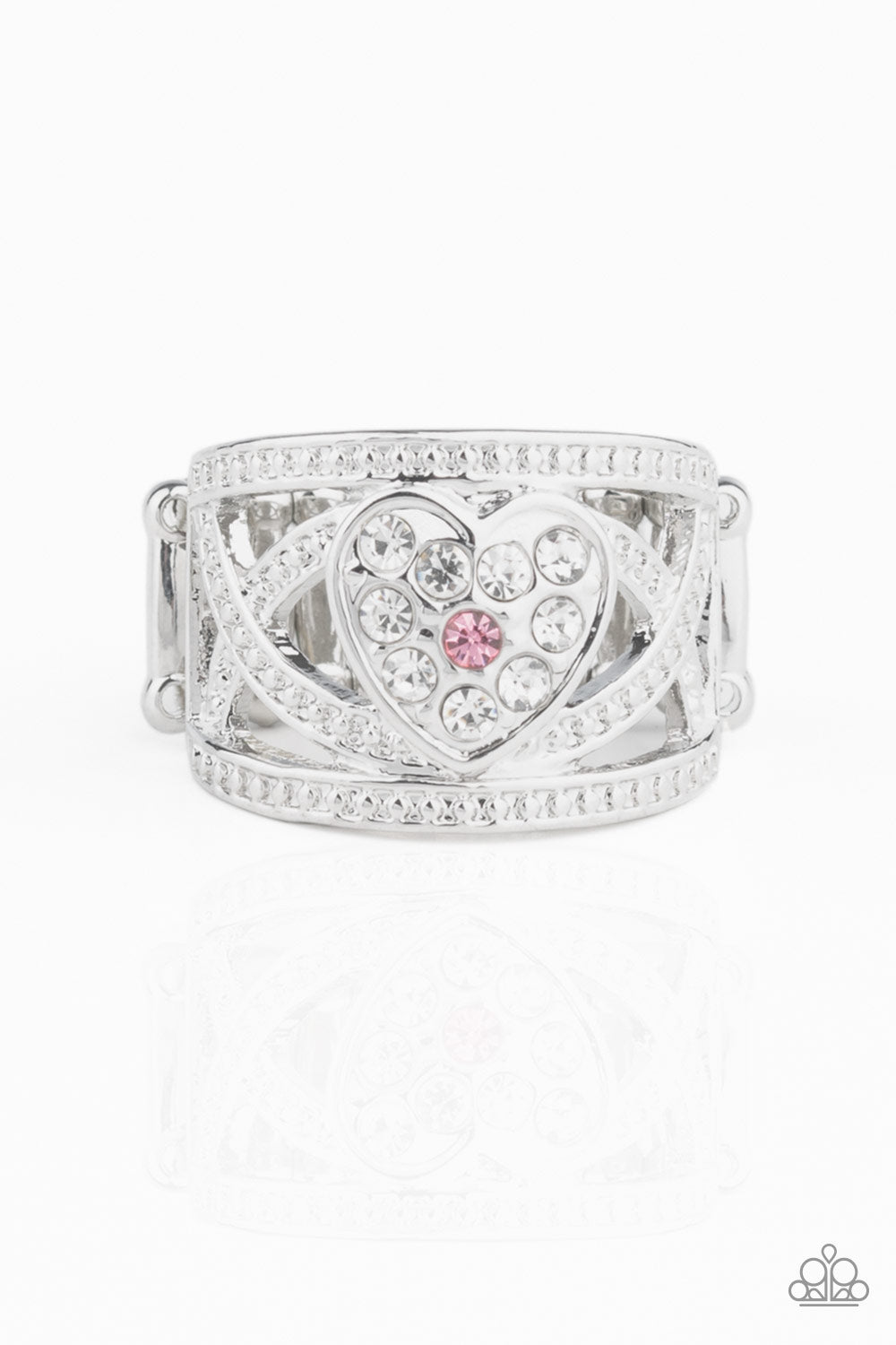 Dotted in dainty silver studs, glistening silver bands weave across the finger. A white rhinestone encrusted silver heart adorns the center, creating a flirtatious centerpiece. A dainty pink rhinestone dots the center for a colorful finish. Features a stretchy band for a flexible fit.