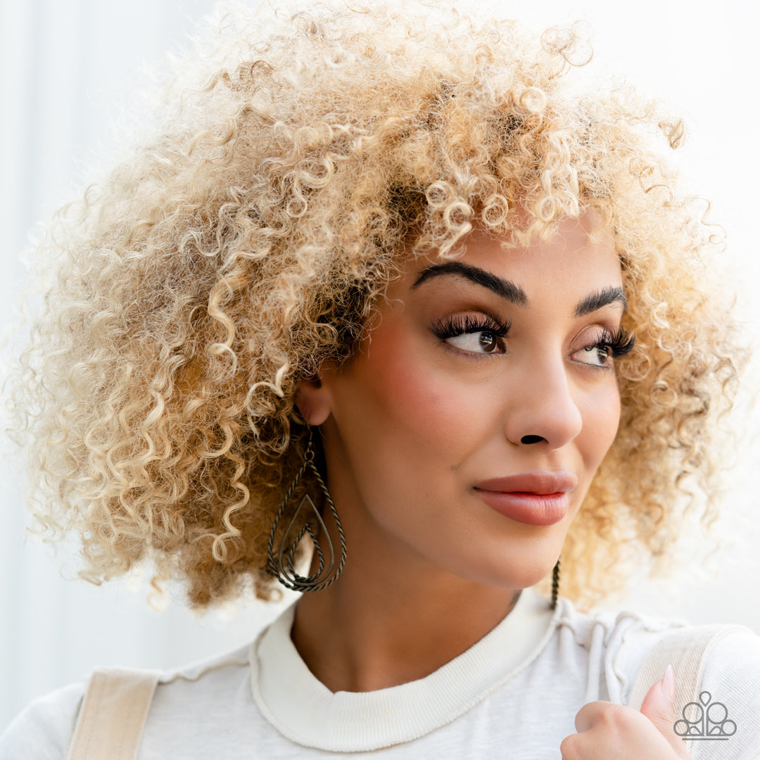 Brushed in an antiqued shimmer, smooth and twisted brass teardrops stack into a rippling rustic lure. Earring attaches to a standard fishhook fitting.