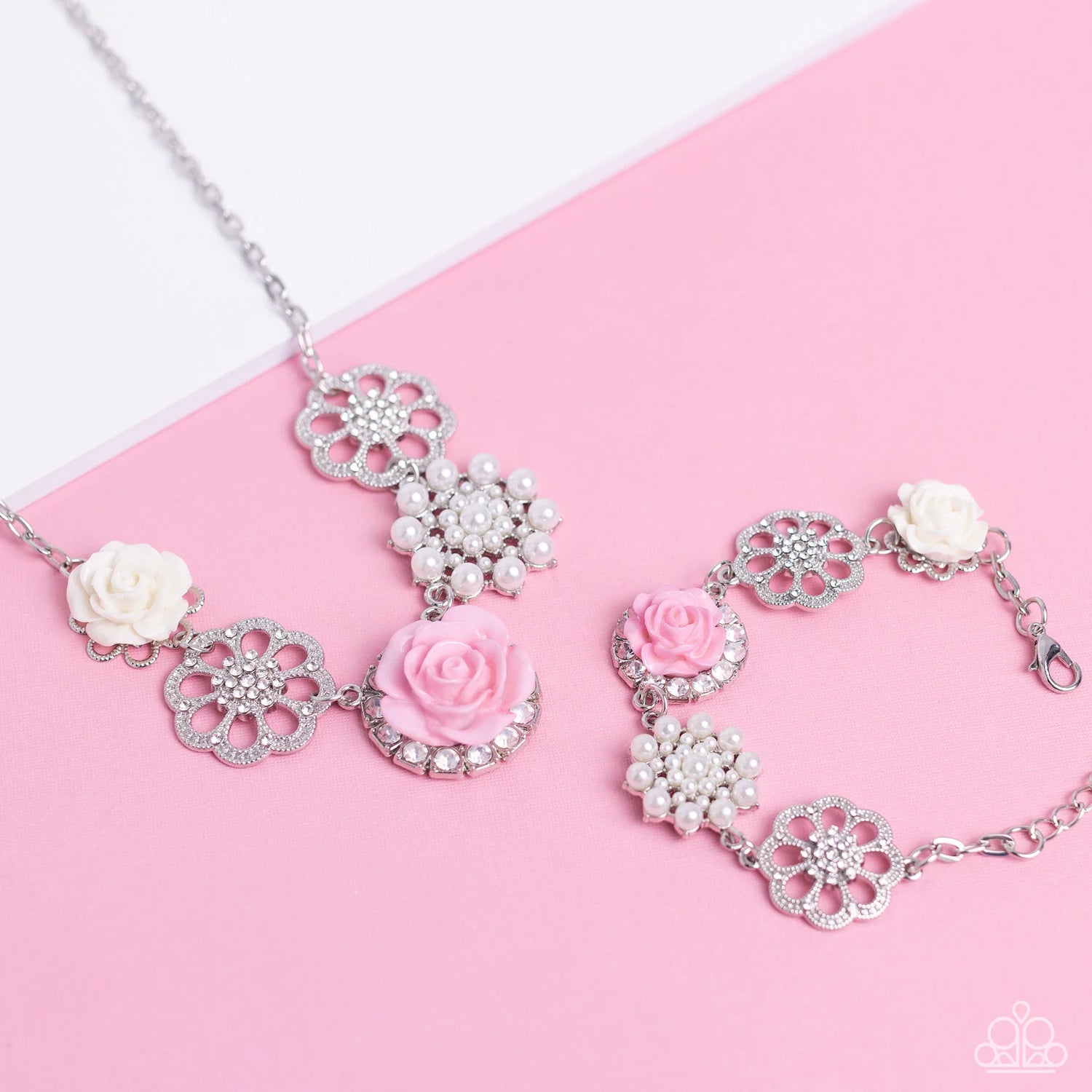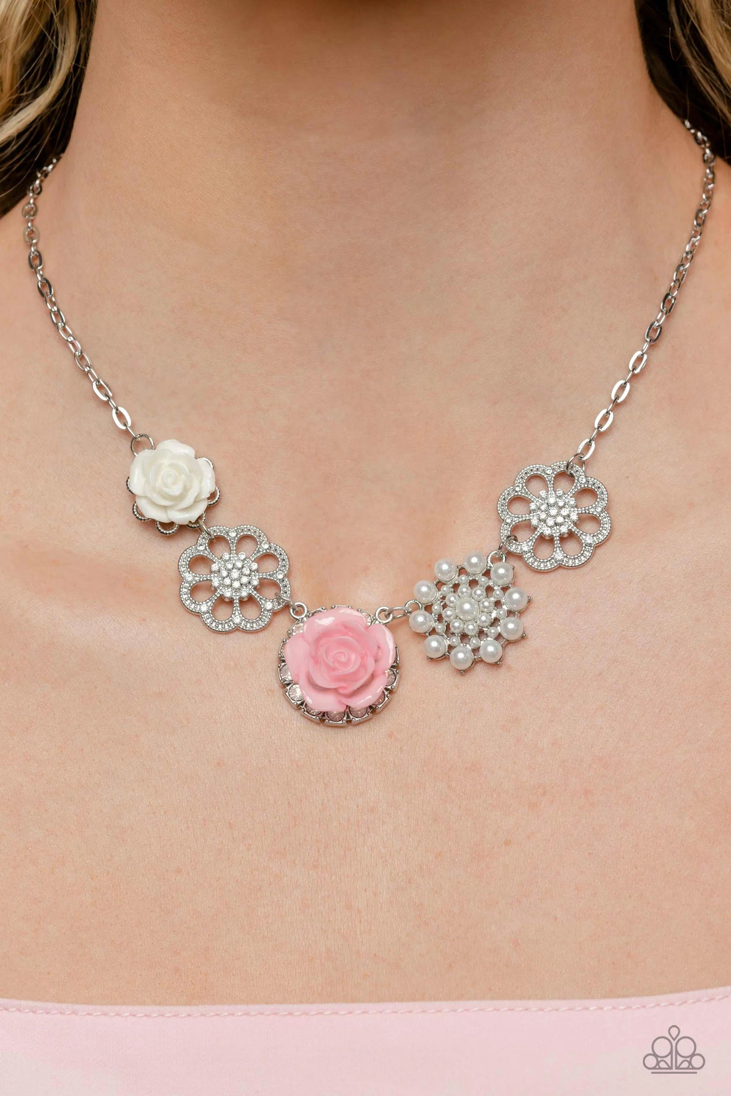 A collection of whimsical, refined flowers gathers along a flat, sleek silver link chain. The featured charms include an ivory resin rose blooming atop a glittery silver floral silhouette, two silver flowers dusted with dainty white rhinestones and studs around its petals and centers, a baby pink resin rose blooming atop a fan of white gems, and a pearl-petaled and centered flower creating a floral fantasy around the collar. Features an adjustable clasp closure.