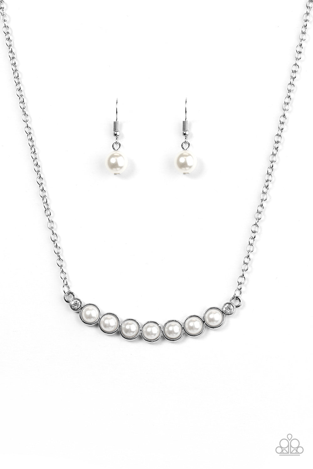 A row of pearly white beading is pressed into a slightly bowing frame, creating a refined pendant below the collar. Two glittery white rhinestones are pressed into the classy pendant for a timeless finish. Features an adjustable clasp closure. Sold as one individual necklace. Includes one pair of matching earrings.