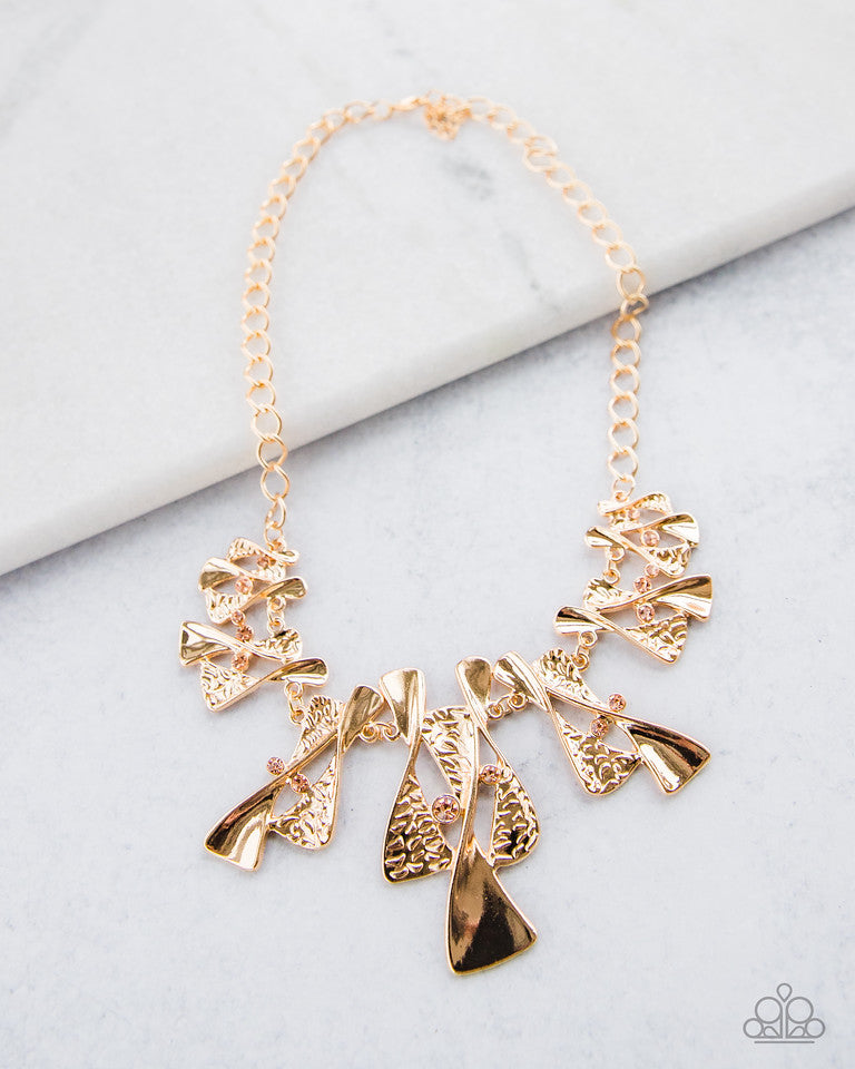 Twisted gold hourglasses dance along a chunky gold chain with tiny peach rhinestones adding sparkling, elegant accents. Beautiful textured pieces add depth to the design. Features an adjustable clasp closure.