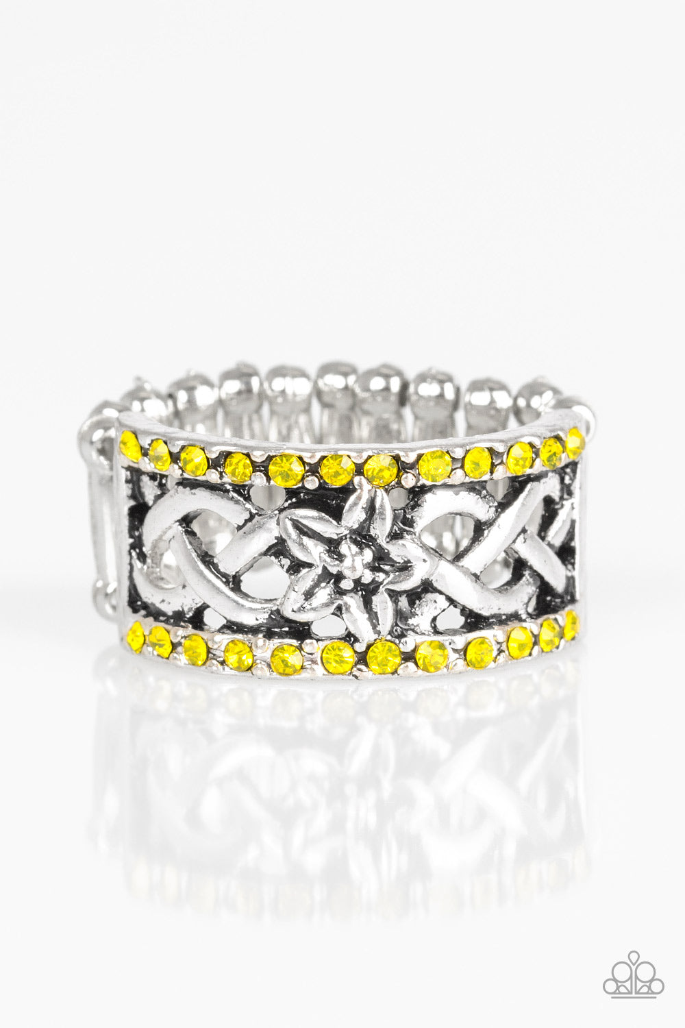 Glistening ribbons of silver crisscross across the finger, coalescing into an airy band. Infused with a summery floral center, the shimmery band is encrusted in rows of glittery yellow rhinestones for a seasonal look. Features a stretchy band for a flexible fit.