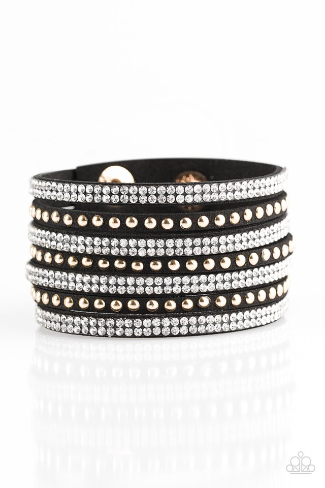 Shiny gold studs and rows of glittery white rhinestones are encrusted along strips of black suede, creating sassy shimmer around the wrist. Features an adjustable snap closure.