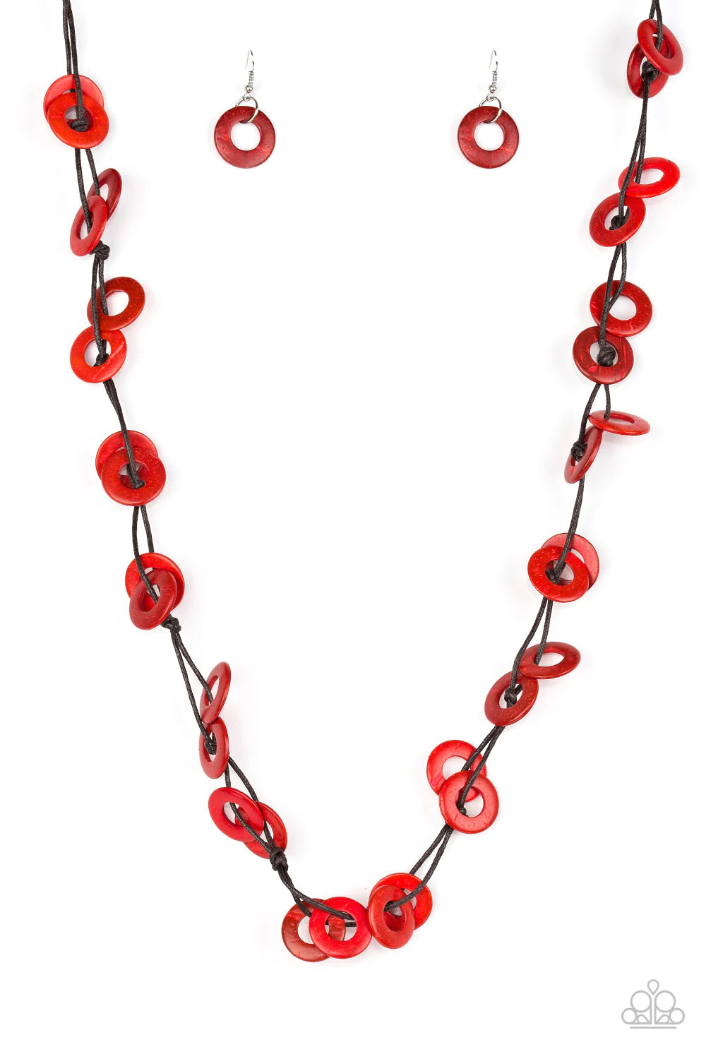 Shiny brown cording knots around fiery red wooden discs, creating a colorful display across the chest. Features a button loop closure.