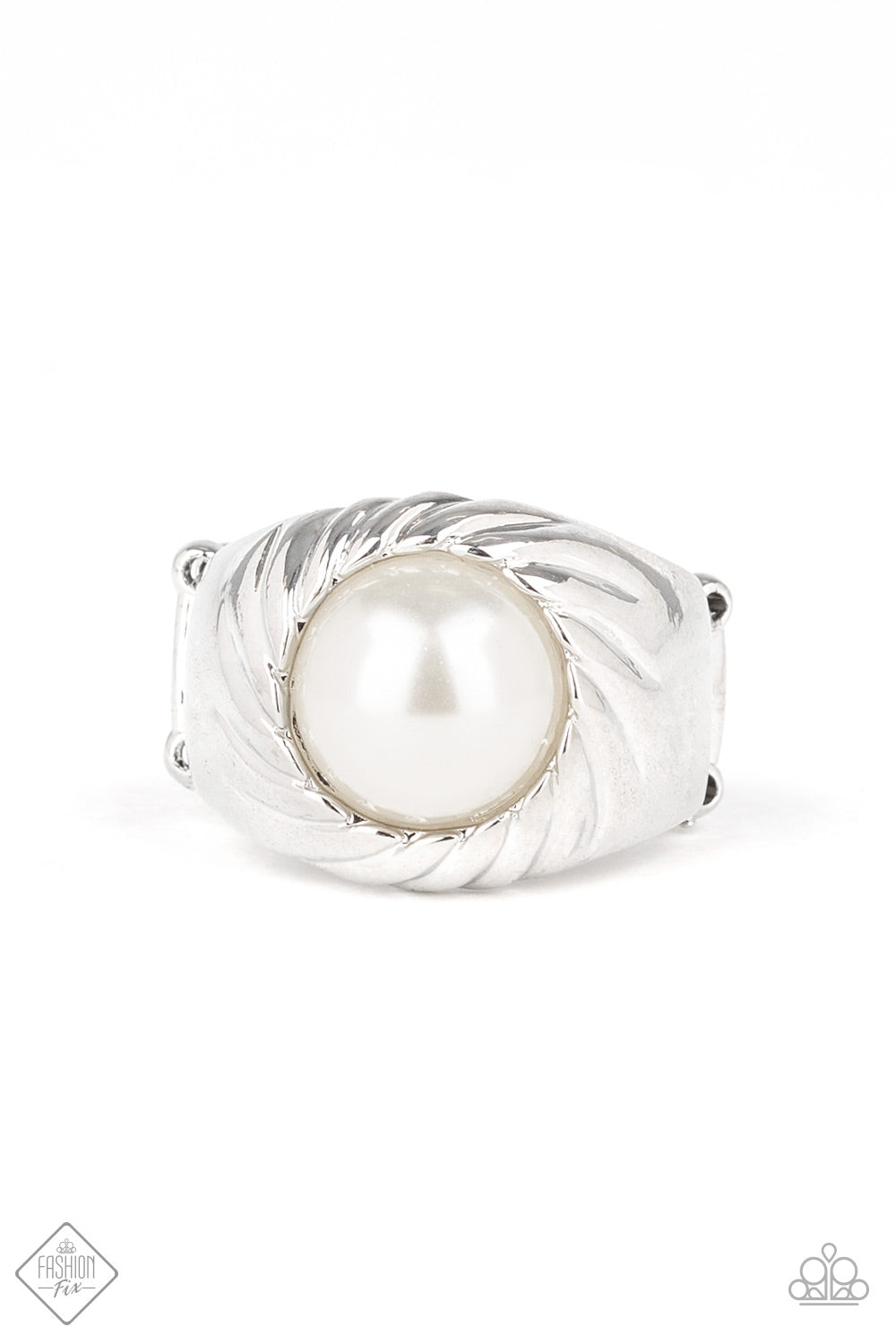 A pearly white bead is pressed into the center of a thick silver band swirling with a spiral-like pattern for a refined flair. Features a stretchy band for a flexible fit.