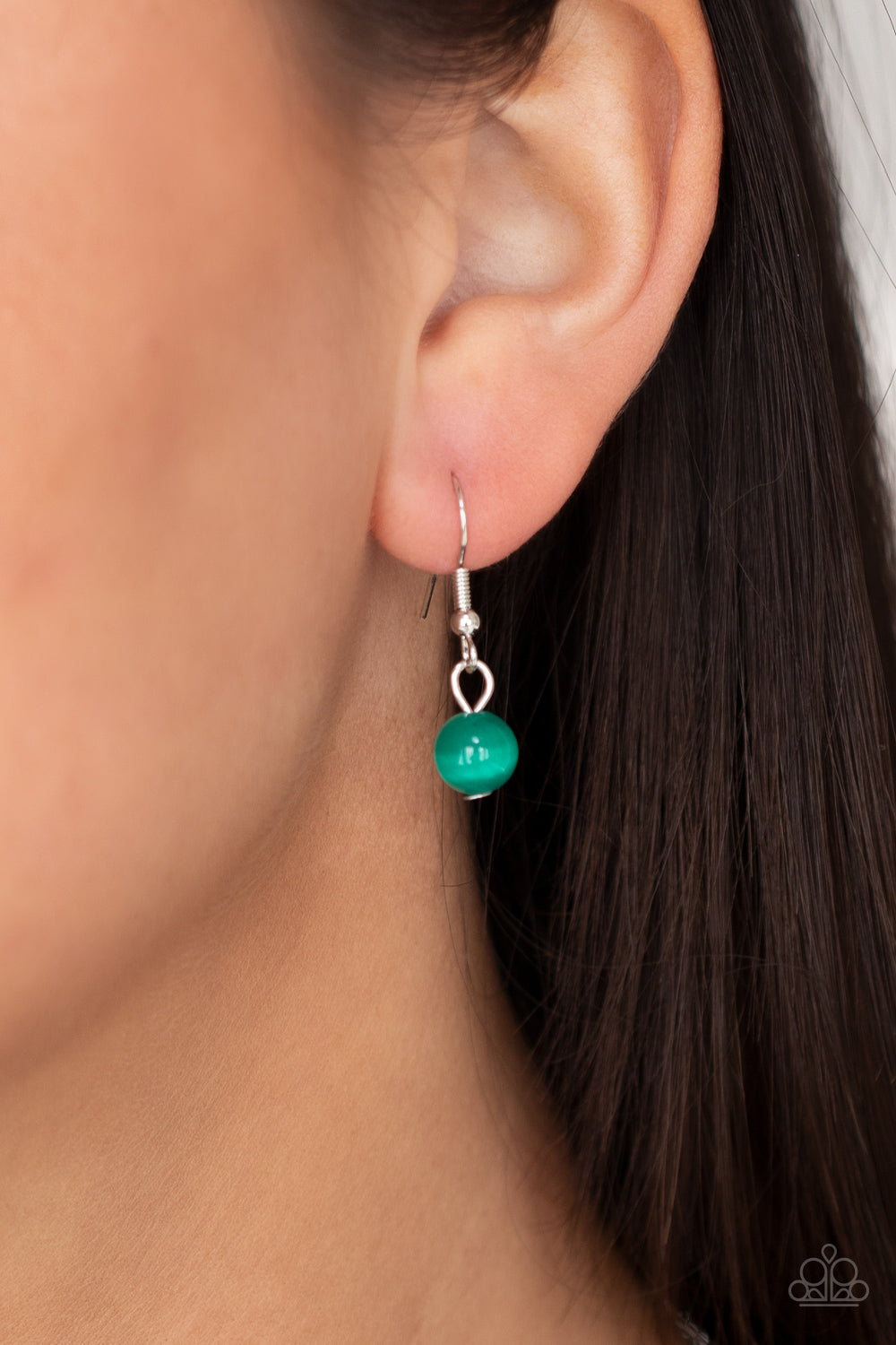 An oversized Mint cat's eye stone frame swings from the bottom of a lengthened silver chain, creating a flirtatious pendant. Features an adjustable clasp closure.
