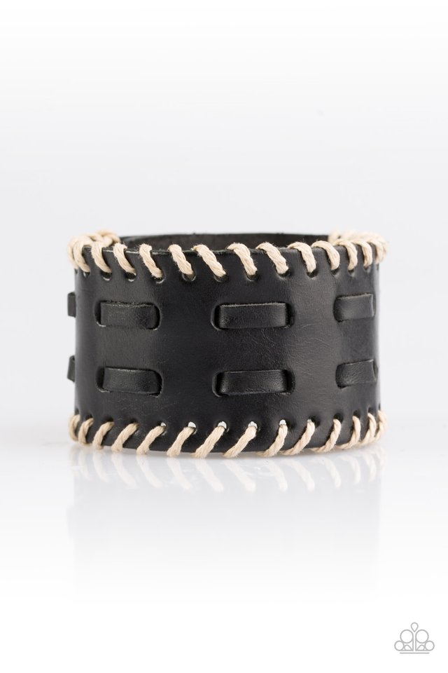 Leather laces are threaded down the center of a thick black leather band. Earthy twine is stitched down the edges of the band, adding a rustic finish to the urban palette. Features an adjustable snap closure.
